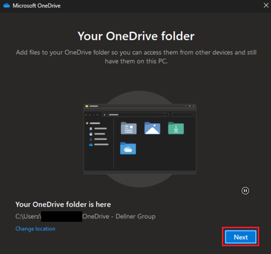 6. Als Nächstes können Sie auswählen, wo Sie die Dateien für Ihr Dellner-Gruppenkonto speichern möchten (standardmäßig ist "C:\Benutzer\%Benutzername%\OneDrive - Firmenname" ausgewählt, was wahrscheinlich die beste Option ist).