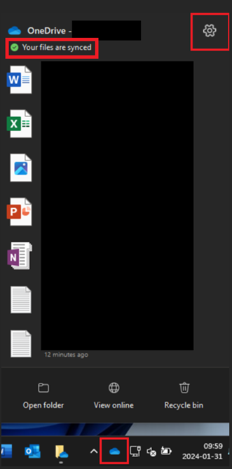 Klicken Sie mit der linken Maustaste auf das Onedrive-Symbol in der Taskleiste und überprüfen Sie, ob dort "Ihre Dateien sind synchronisiert" angezeigt wird.